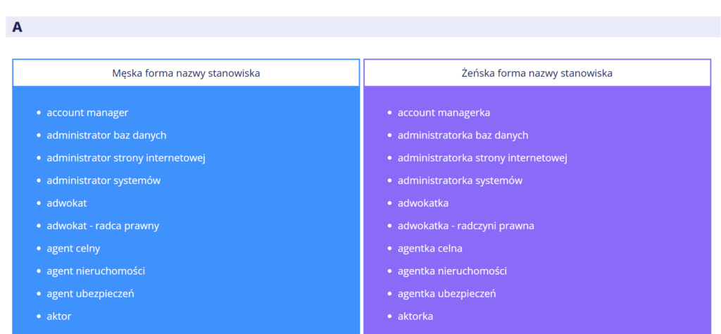 - formy dwurodzajowe tam, gdzie to konieczne, np. specjalista/specjalistka ds. marketingu.