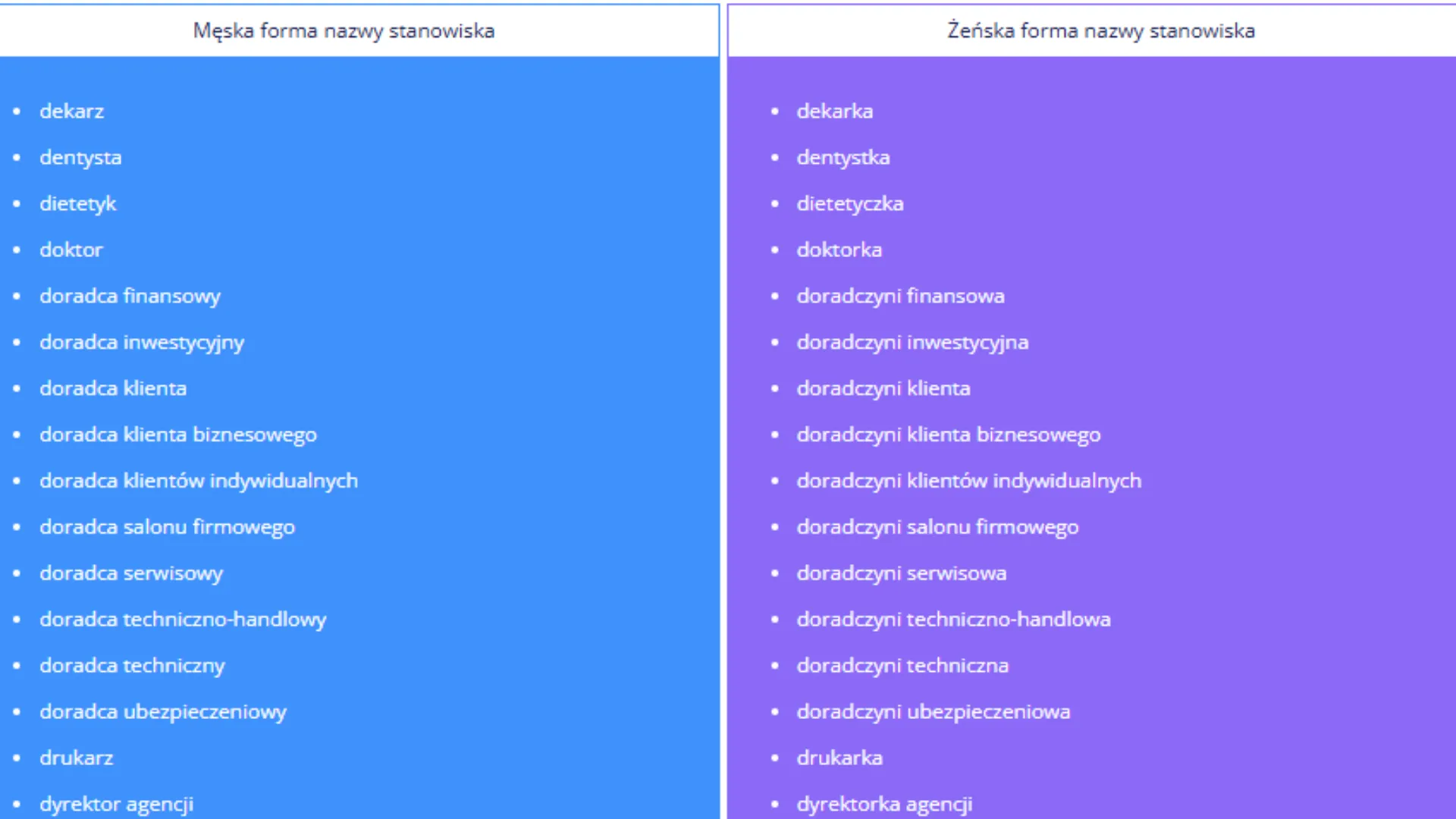 - formy dwurodzajowe tam, gdzie to konieczne, np. specjalista/specjalistka ds. marketingu.