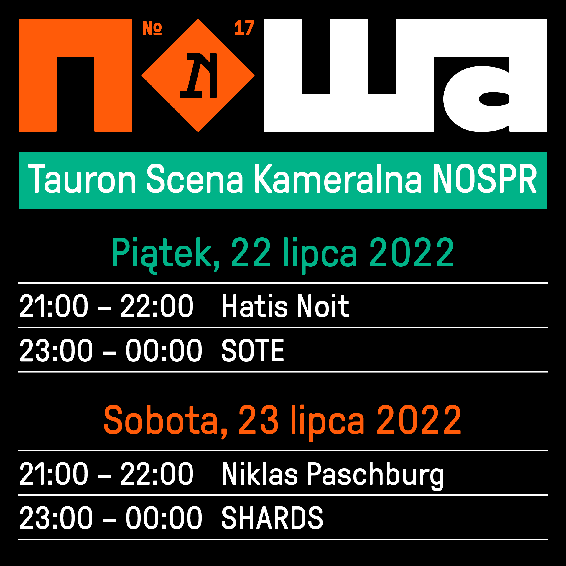 Na festiwalu nie mogło zabraknąć również mniej popularnych, nietuzinkowych brzmień z pogranicza abstrakcji i eksperymentu. Zadbają o nie artyści zaproszeni na Scenę Kameralną NOSPR. Za sprawą Sote doświadczymy zderzenia zawansowanych technologii z wielowiekową tradycją muzyczną Persji. Wokalne eksperymenty zaprezentuje japońska artystka Hatis Noit, a także dwunastoosobowa grupa wokalna Shards. Wystąpi obiecujący kompozytor, pianista i producent Niklas Paschburg, który właśnie dołączył do programu wydarzenia. Twórczość niemieckiego artysty łączy klasykę z ambientem i popem, generując wysmakowany chillout. Tauron Scena Kameralna NOSPR gwarantuje wysokie doznania i będzie jedną z najbardziej intrygujących podczas zbliżającej się edycji festiwalu.