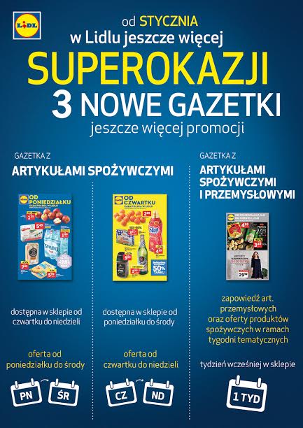 W styczniu zapowiada się kolejna rewolucja w sieci Lidl Polska –w sklepach dostępne będą aż 3 różne gazetki z ofertą promocyjną. Klienci Lidla znajdą je w sklepach w poniedziałki oraz czwartki - i to nie koniec nowości, jakie planuje sieć dla swoich klientów w nowym roku!