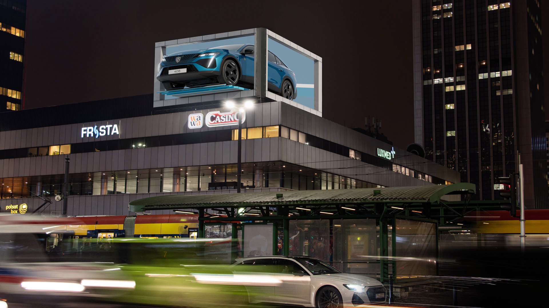 Trójwymiarowy PEUGEOT 408 pojawia się na narożnym ekranie Screen Network przy warszawskim hotelu Marriott – w ścisłym centrum stolicy. Dzięki wykorzystaniu efektu anamorficznego 3D, spot oglądany z określonego punktu tworzy iluzję trójwymiarowej głębi na płaskiej powierzchni. Dzięki temu bohater spotu – nowy PEUGEOT 408 – sprawia wrażenie „wysuwania się” się poza granice ekranu. Ten zabieg przyciąga uwagę przechodniów, a także odbiorców w internecie, naturalnie zwiększając zasięg kampanii.
