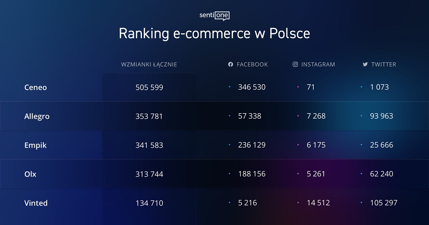 Pod względem całkowitej liczby wzmianek bezkonkurencyjnie prowadzi serwis Ceneo, wymieniany 505,6 tys. razy. Niemal ¼ tych wypowiedzi pochodzi z lipca tego roku. Drugie w kolejności jest Allegro – ponad 353,7 tys. wzmianek – a trzecie miejsce zajmuje Empik – 341,6 tys. wzmianek. Za nim zlazły się: serwis OLX (313,7 tys. wzmianek), platforma do sprzedaży używanych rzeczy Vinted (134,5 tys. wzmianek), sieć drogerii Rossmann (105,2 tys. wzmianek), księgarnia TaniaKsiazka.pl (76,2 tys. wzmianek) oraz serwisy Aliexpress (55,3 tys. wzmianek), Amazon (50,8 tys. wzmianek) i Shopee (36,4 tys. wzmianek). Pod względem zasięgu natomiast pierwsze trzy miejsca zajmują Allegro, OLX i Empik.