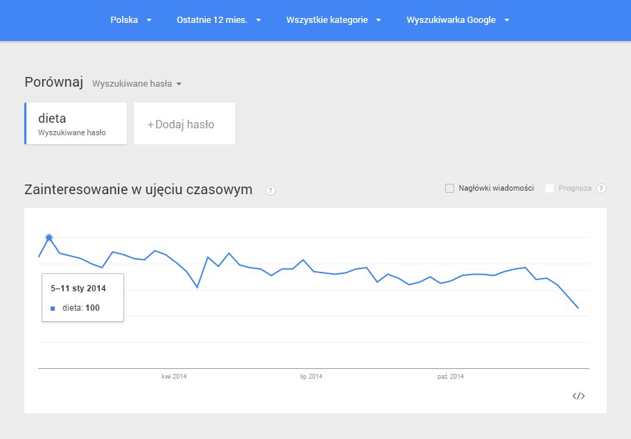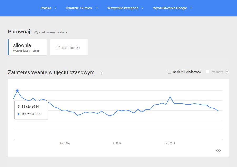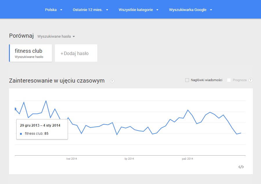 Zgodnie z trendami Google Trends, zainteresowanie zapytaniami dla haseł takich jak „siłownia”, „fitness klub”, czy „dieta” jest wyraźnie częstsze w pierwszym kwartale roku, w szczególności w styczniu.