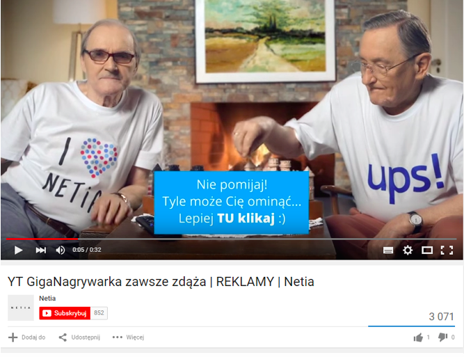 Pierwsze skojarzenie – LIDL, drugie – PZU. Ja jednak chciałabym wyróżnić tę kampanię, która w idealny sposób została przygotowana pod format Pre-Roll na YouTube. Jest to kampania sieci NETIA i promocja usługi nazwanej GigaNagrywarką. W roli głównej starsi panowie, pensjonariusze domu spokojnej starości, prowadzą zabawne dyskusje przed telewizorem na temat zalet usługi. Powstało 8 spotów, w których dialogi są ogromną siłą. Wykorzystano też wszelkie formy angażujące widza.
