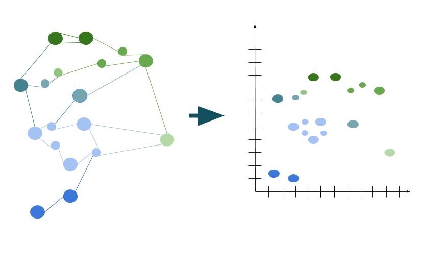 Jednym z możliwych zastosowań AI jest segmentacja bazująca na analizie klastrowej, w której wykorzystujemy embedding grafów do n-wymiarowej przestrzeni wektorowej. Połączenia pomiędzy wierzchołkami stają się wtedy miarami odległości, które można opisać na liczbowych osiach. Dzielenie populacji w przestrzeni odbywa się automatycznie, na bazie określonej w modelu miary bliskości – mówiąc skrótowo, klienci w każdym klastrze są bliżej siebie nawzajem, niż któregokolwiek z klientów w pozostałych klastrach.