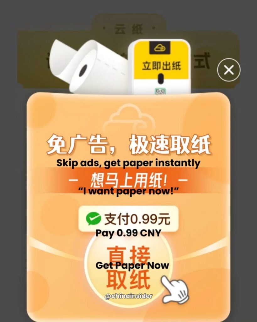 W kilku chińskich toaletach publicznych użytkownicy napotykają nową regułę: najpierw skanujesz QR-kod, następnie oglądasz krótki spot reklamowy na swoim telefonie, a dopiero potem dostajesz ograniczoną liczbę kawałków papieru toaletowego. Mechanizm ten ma na celu ograniczenie nadmiernego zużycia papieru i promowanie racjonalnego podejścia do surowców drzewnych.