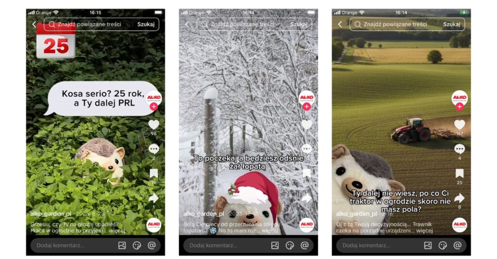 Takim przykładem „hakowania uwagi” jest seria tiktoków na profilu AL-KO Garden, w której narrację prowadzi złośliwy jeż-maskotka. W ten absurdalny sposób marka opowiada o swoich produktach, ale zamiast nudnej specyfikacji technicznej kosiarki, dostajemy kąśliwe uwagi od gadającej maskotki. To właśnie ten zgrzyt sprawia, że marka przestaje być przezroczysta.