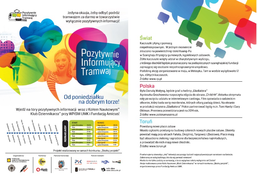 Pozytywnie Informujący Tramwaj to akcja organizowana przez Studenckiego Koło Naukowe „Klub Dziennikarza” Wydziału Politologii i Studiów Międzynarodowych. Inicjatywa łączy trzy obszary: media, społeczeństwo i szeroko pojętą komunikację. Studenci dziennikarstwa, a w szczególności członkowie Klubu Dziennikarza będą wprawiać w dobry nastrój zmierzających do pracy i szkoły mieszkańców Torunia. W wynajętym tramwaju adepci dziennikarstwa wcielą się w prezenterów, którzy przez kilka godzin będą komunikować pasażerom same dobre wiadomości.