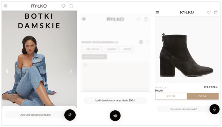 Jak wygląda to w praktyce? Popatrzmy na przykład sklepu Ryłko, którego Klienci już niedługo będą mogli zacząć testować Voice Search w poszukiwaniu wymarzonych butów. Nie będą musieli używać tradycyjnych filtrów – wystarczy kliknąć w ikonkę mikrofonu i zacząć opisywać wybrany produkt.