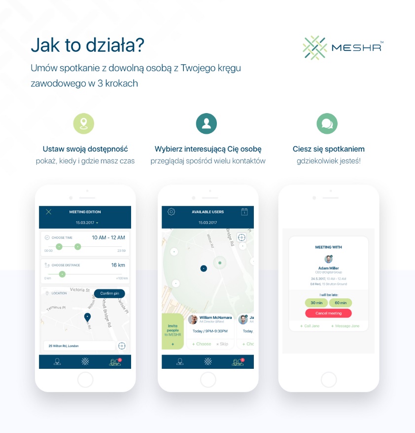 Warunkiem dostępu do MESHR jest posiadanie aktywnego konta na Linkedinie, z którym aplikacja jest zintegrowana. Dalej można umówić spotkanie w trzech prostych krokach: