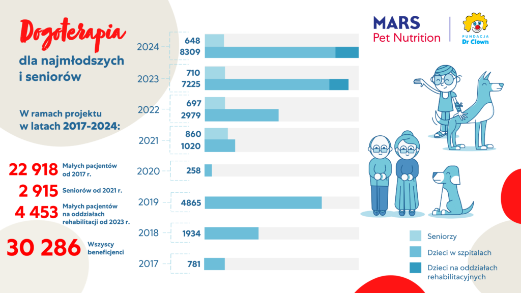 Program rozwija się z każdym kolejnym rokiem. Na początku były w niego zaangażowane cztery szpitale, a rok 2024 to już łącznie 42 placówki, w których odbywają się zajęcia, w tym 27 szpitali i 15 DPS-ów. Tylko w 2024 roku z zajęć z udziałem certyfikowanych dogoterapeutów i wyszkolonych psów skorzystało 8957 osób – 8309 małych pacjentów i 648 seniorów. To blisko 13% wzrost w porównaniu do 2023 roku.