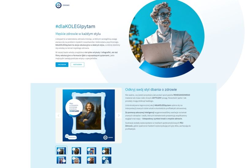 Jednocześnie ruszyliśmy z intensywną komunikacją w social mediach – Facebook, Instagram, LinkedIn. W każdym tygodniu publikowaliśmy dwa posty z promującymi akcję grafikami. Inspirowane klasycznymi dziełami sztuki kreacje odnoszą się do konkretnych problemów zdrowotnych. Każdy post zawierał odnośnik do artykułu przybliżającego poruszaną tematykę.