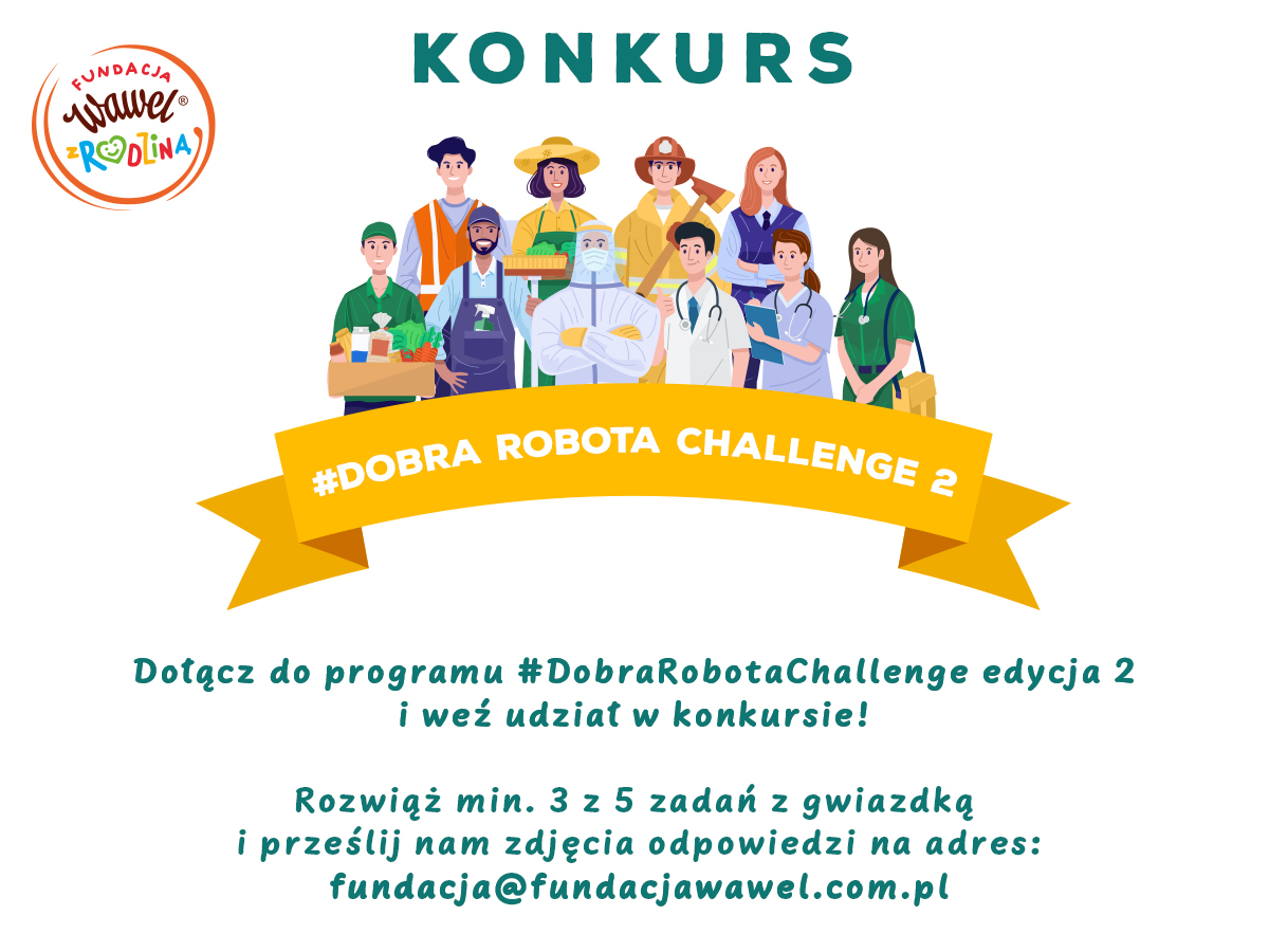 Autorem akcji #DobraRobotaChallenge jest Fundacja Wawel z Rodziną, która od 2008 roku aktywnie kontynuuje działalność dobroczynną firmy Wawel. W swoich działaniach Fundacja wspiera inicjatywy poszerzające wiedzę, zdolności dzieci, tak, żeby było im łatwiej wejść w dorosłe życia. Aktywnie angażuje się w pomoc społeczną i edukacyjną oraz wspieranie polskich rodzin, osób i instytucji sprawujących opiekę zastępczą nad dziećmi. Fundacja aktywnie wspiera także świetlice środowiskowe.