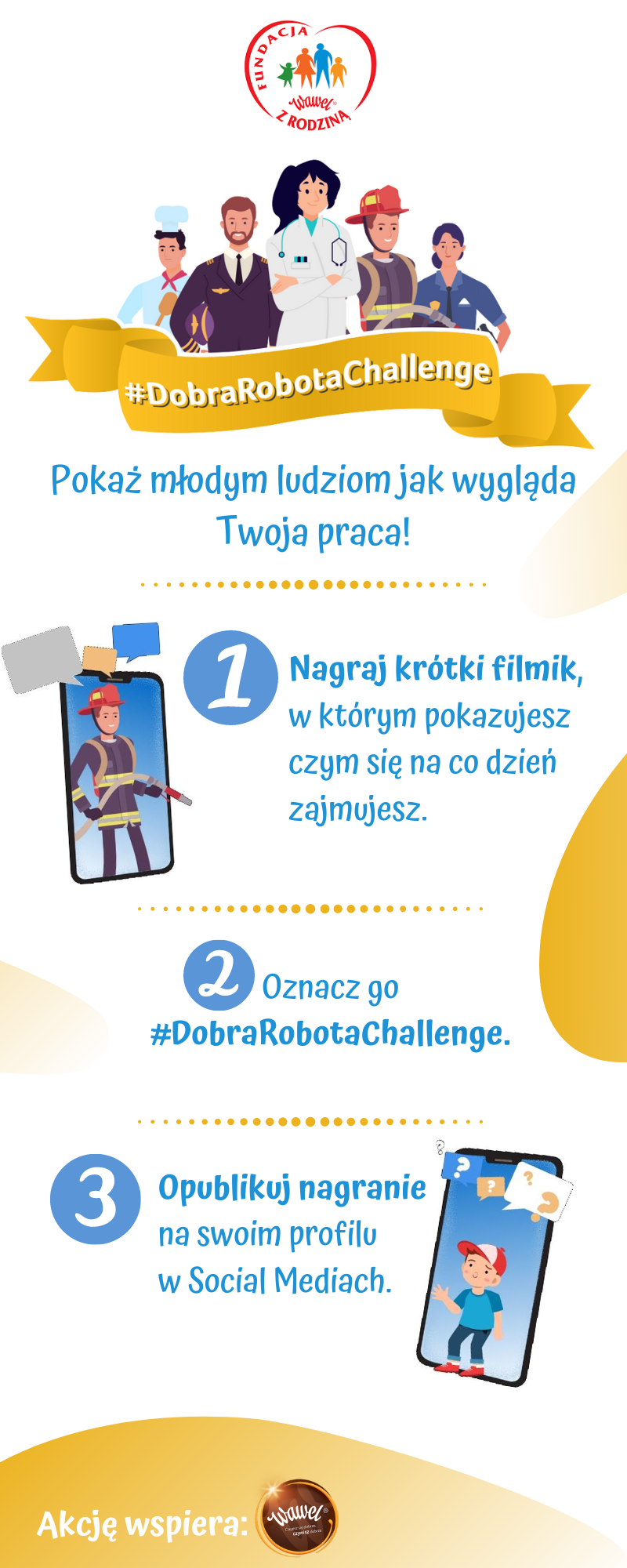 Inspirując się poruszającymi koncertami online i różnymi challenge’ami, które krążyły wtedy w sieci, wpadliśmy na pomysł zorganizowania własnego challenge’u, spójnego z działalnością naszej Fundacji. Epidemia koronawirusa zmieniła też sposób pracy w wielu zawodach, dlatego uświadomiliśmy sobie, jak mało wiemy nawzajem o swojej pracy. Było to impulsem do rozpoczęcia #DobraRobotaChallenge. Uznaliśmy, że warto pokazać dzieciom i młodzieży, na czym polega praca w poszczególnych zawodach.