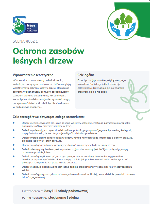 „Velvet. Piątka dla Natury” składa się z dwóch filarów. Pierwszy filar skierowany jest do nauczycieli i uczniów klas I-III. Obejmuje scenariusze lekcji z zakresu pięciu obszarów, zobrazowanych przez znak „Save Nature” – są to: