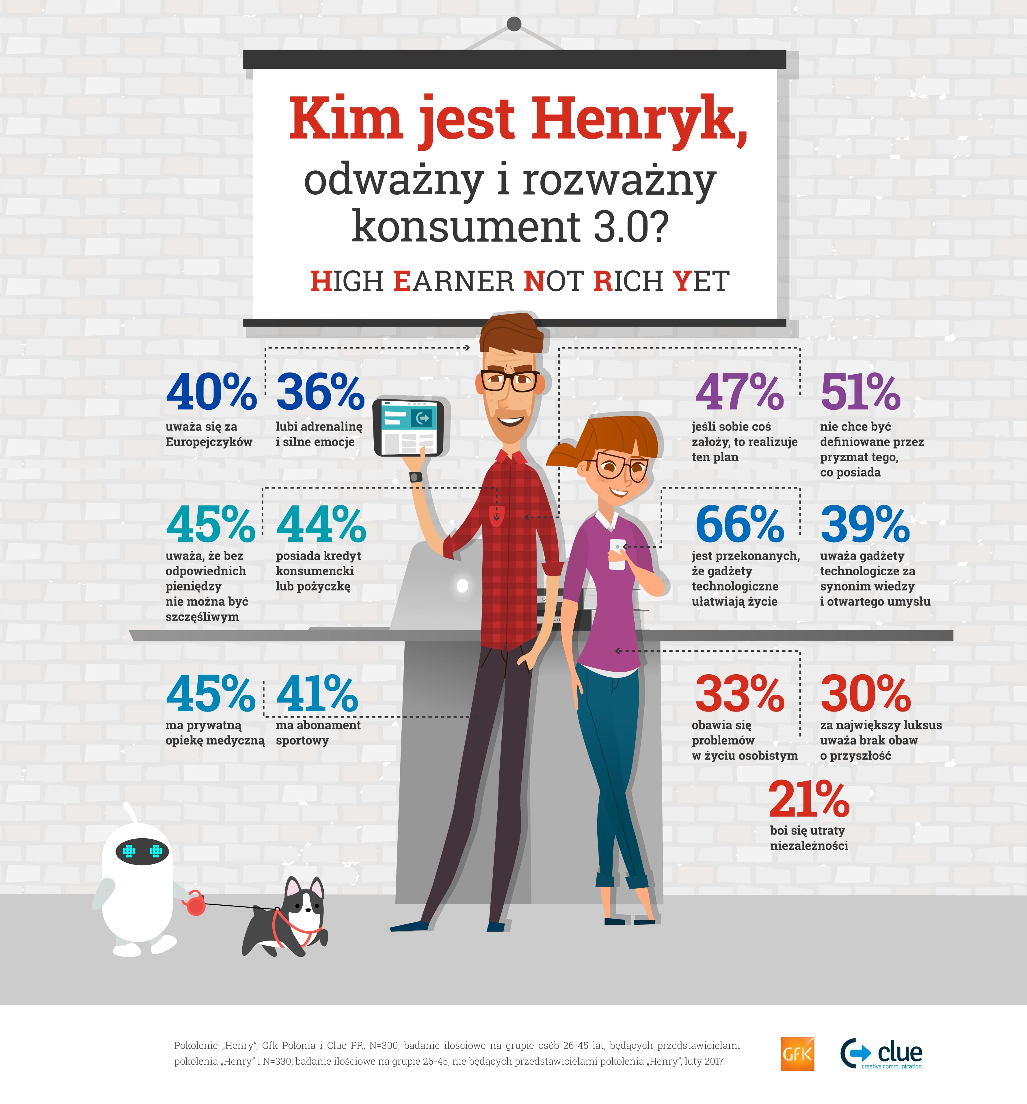 Pomiędzy Generacją Z, Y i Millenialsami wyrosła w Polsce silna grupa konsumentów: Henryków, żyjących wygodnie, niekiedy z rozmachem, ale nie rozrzutnie, wynika z najnowszego badania GfK Polonia i Clue PR. To pokolenie zbadane na Zachodzie, w Polsce dotąd nie brane pod lupę. Istotne pod względem przychodów i wydatków na technologie, produkty finansowe, odzież i motoryzację. Liderzy opinii w swoich środowiskach, ciekawi świata, ale mocno skupieni na sobie. Autorzy raportu „Pokolenie Henry” zbadali portfele i światopogląd Henryków, zajrzeli do ich szaf, zapytali, czym dla nich jest luksus i czego się obawiają. Jak ich obraz wypada na tle przeciętnych Polaków?