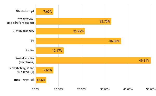Ponad 49% badanych szuka atrakcyjnych ofert z okazji Black Friday w mediach społecznościowych (Facebook, Instagram), 32% korzysta z oficjalnych stron internetowych marek jako głównego źródła informacji o okazjach, a ponad 36% sprawdza reklamy telewizyjne.