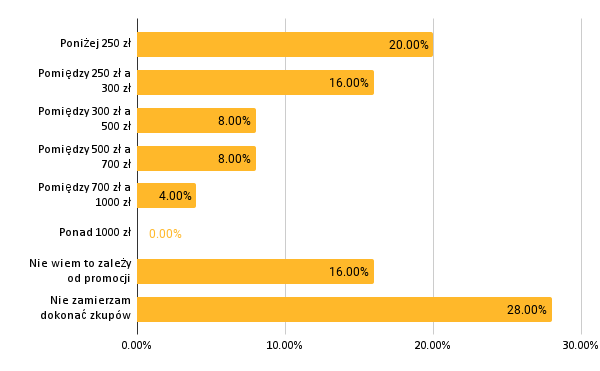 Większość badanych konsumentów (28%) nie podjęła jeszcze decyzji, ile wyda, 20% planuje wydać poniżej 250 zł, a 16% między 250 zł a 300 zł.