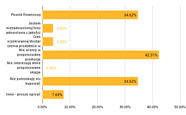 Główne powody, dla których prawie 13% respondentów nie planuje w tym roku zakupów w Black Friday, to brak wiary w prawdziwość proponowanych promocji (43%), niepewność finansowa (35%) oraz brak potrzeby kupienia czegoś konkretnego (35%). Jednak 68% z nich jest gotowych skorzystać z okazji, jeśli znajdzie naprawdę dobrą ofertę.