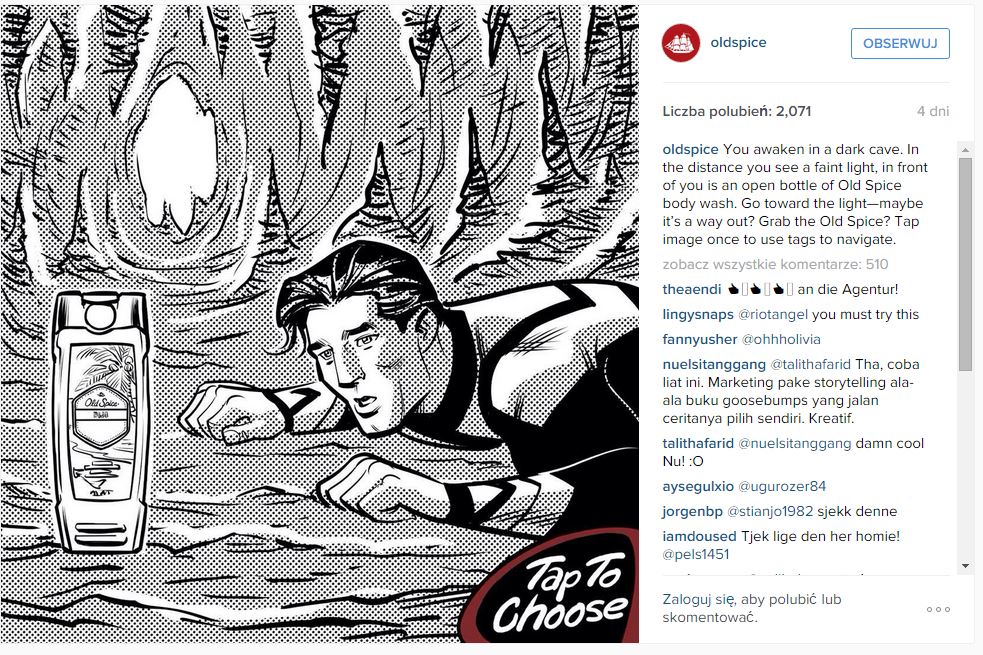 Kilka dni temu pojawiła się kolejna interaktywna gra stworzona przez Old Spice i Wieden+Kennedy, tym razem na Instagramie. Użytkownik dokonując wyboru i klikając w jedną z możliwych opcji przeżywa przygodę w czarno-białym świecie sci-fi.