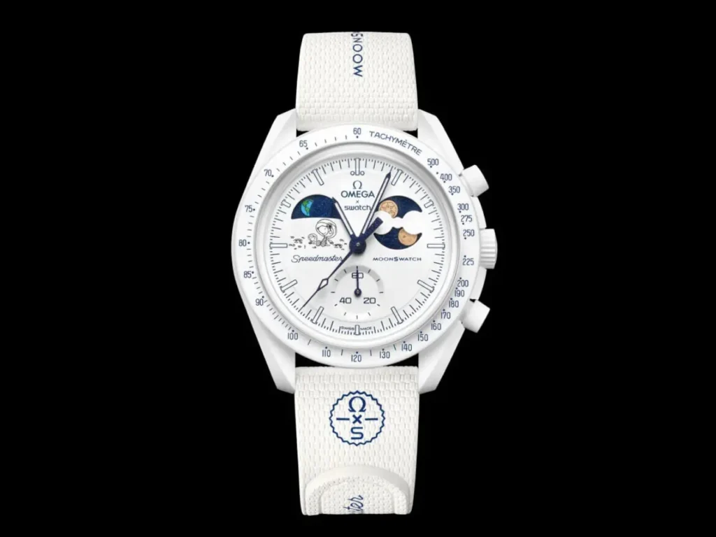 Pierwotna wersja dostępnego w zawrotnej cenie zegarka Speedmastera Moonwatch, w 1969 roku trafiła na nadgarstek Buzza Aldrina , jednego z uczestników pamiętnej misji Apollo 11. W masowo dostępnym modelu Bioceramic Moon-Swatch zastosowano wiele udogodnień analogicznych do tych, stosowanych przez astronautów, m.in. paski zapinane na rzepy, które ułatwiały eksploratorom kosmosu noszenie zegarków na grubych skafandrach.