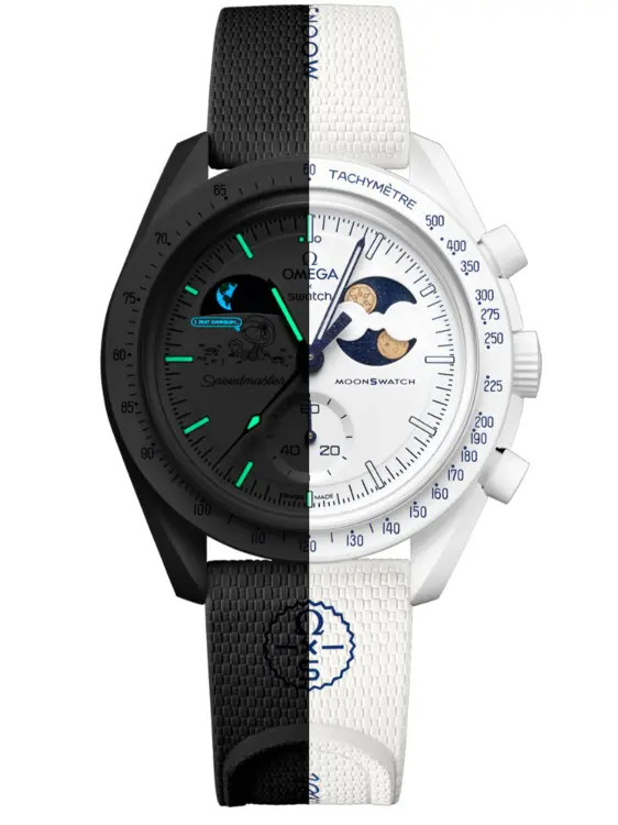 Zegarek charakteryzują m.in. design nawiązujący do ośnieżonego krajobrazu oraz tarcza wyposażona w element wskazujący fazy księżyca. Dodatkowo, funkcja Earthphase pozwala na podziwianie wizerunku Ziemi widzianej z Księżyca. Jednocześnie Swatch i Omega nie zapomniały o odrobinie humoru: na zegarku widnieje dobrze znana postać Snoopiego, tym razem w iście zimowej stylizacji.