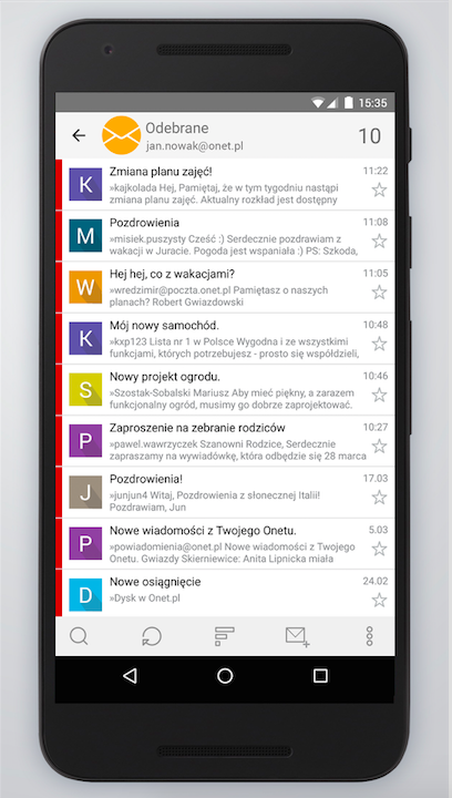 Aplikacja OnetPoczta pozwoli użytkownikom na łatwiejszy i szybszy dostęp do kont pocztowych na Onecie bezpośrednio z poziomu telefonu z systemem Android. Użytkownicy OnetPoczty którzy korzystaja z kilku adresów e-mail będą mogli je skonfigurować w jednym miejscu i płynnie przełączać się miedzy skrzynkami i folderami.