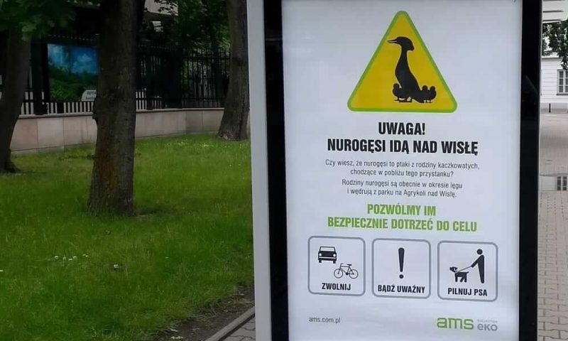 I jeszcze jeden ciekawy proptasi projekt, tym razem edukacyjny. W Warszawie na przystankach w pobliżu Agrykoli, w sezonie wędrówek nurogęsi AMS prowadzi kampanię informacyjną, zwracając uwagę przechodniów i kierowców na zachowanie ostrożności w miejscu, gdzie przemieszczają się te ptaki.
