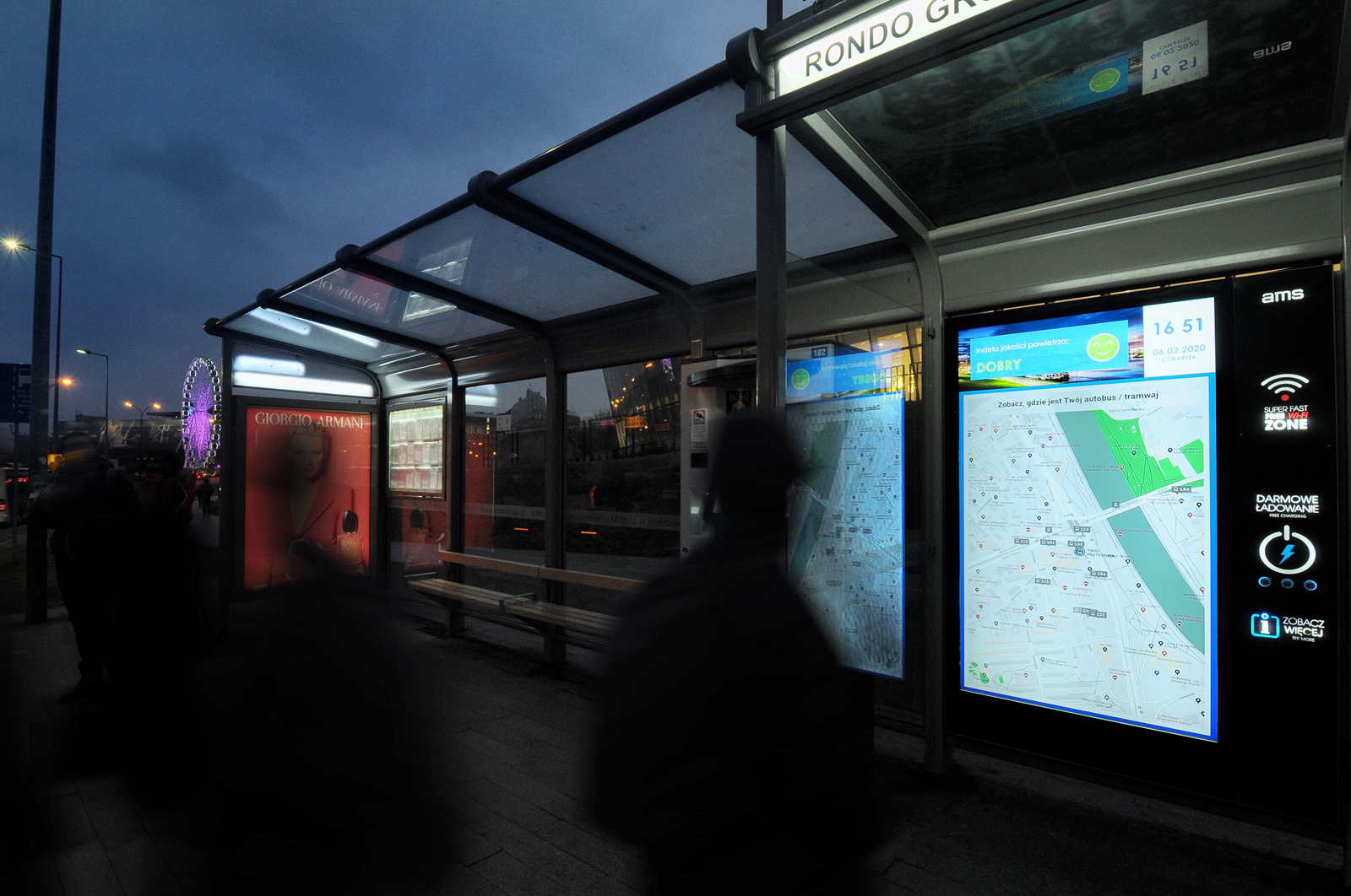 Słupy reklamowe zasilane wyłącznie energią słoneczną to pierwsze ekologiczne rozwiązania, które AMS wprowadził na ulice, a obecnie jest liderem w branży, dysponując największą w Polsce siecią słupów fotowoltaicznych niewymagających zasilania zewnętrznego. To ekologiczne rozwiązanie AMS przenosi teraz również na nośniki przystankowe, poniżej przykład realizacji w Lublinie: