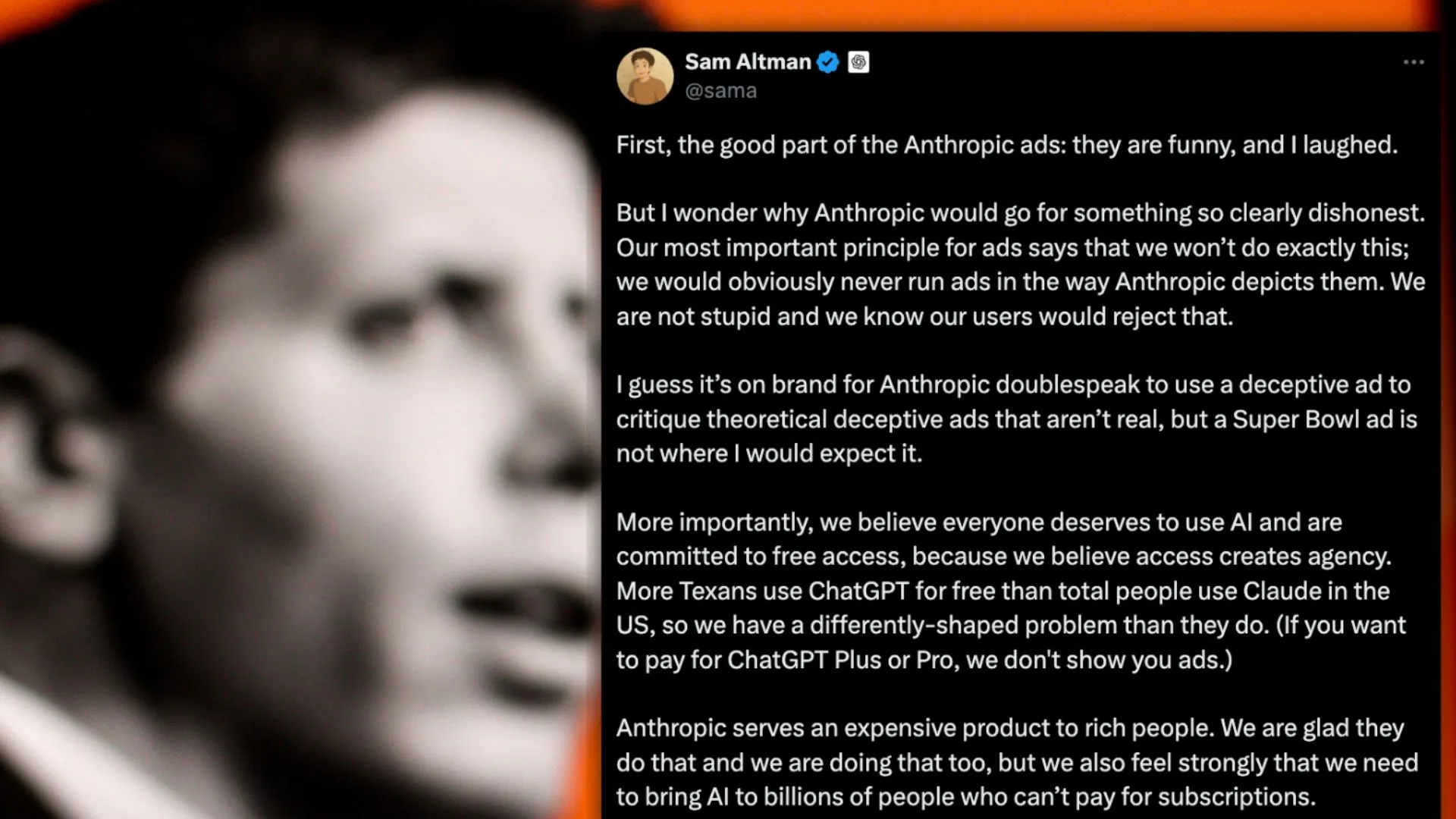 Reklama Anthropic na Super Bowl, obiecująca Claude'a bez natrętnych banerów, rozpaliła publiczną burzę. Sam Altman z OpenAI oskarża rywala o manipulację.