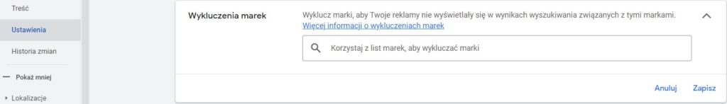 Obecnie można wykluczyć brand na poziomie kampanii.