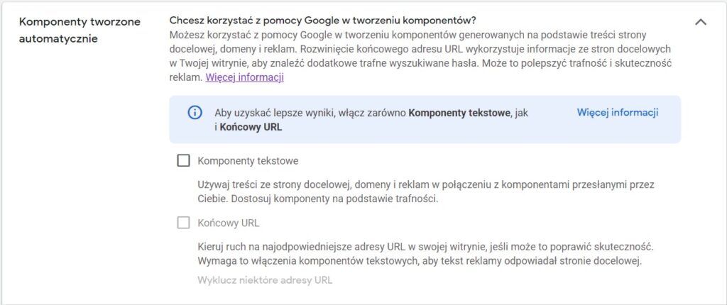 Gdy kierujesz reklamy na określoną stronę docelową i nie chcesz automatycznego rozszerzania URL przez system, wyłącz opcję „Komponenty tworzone automatycznie”. Aby mieć pełną władzę nad treścią i materiałami reklamowymi należy zrezygnować z opcji, która pozwala Google’owi na tworzenie i publikowanie materiałów reklamowych za Ciebie.