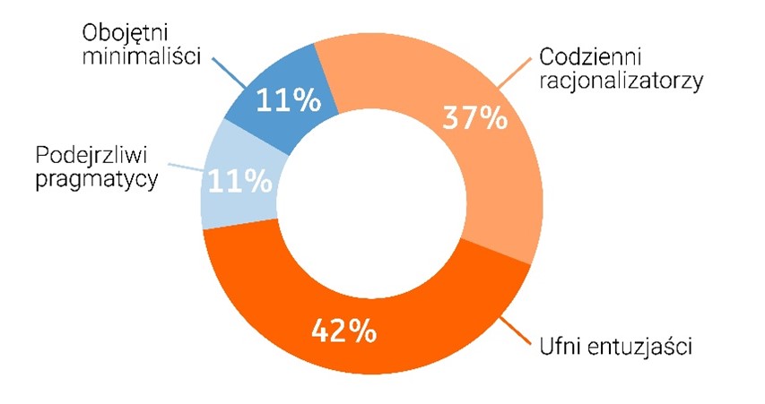 Przedstawiciele poszczególnych grup nie różnią się natomiast znacząco, jeśli chodzi o posiadane produkty finansowe – w podobnym stopniu sięgają zarówno po produkty oszczędnościowe, jak i kredytowe. Zbliżone jest również wykorzystanie płatności bezgotówkowych i nawet obojętni minimaliści nie stronią od BLIKa – za zakupy online płaci nim 66 proc. z nich, w porównaniu z 80 proc. ufnych entuzjastów. Nie jest dla nich czymś obcym także otwarcie przez Internet konta bankowego (49 proc.) czy zawarcie umowy kredytu ratalnego (26 proc.).