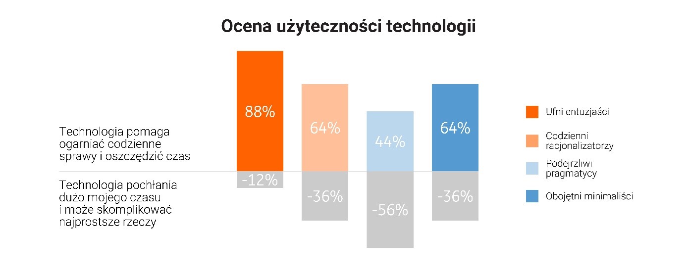 Bardzo duże różnice ujawniły się w ocenie użyteczności technologii. Ze stwierdzeniem, że „technologia pomaga ogarniać codzienne spawy i oszczędzać czas” zgodziło się prawie 9 na 10 ufnych entuzjastów, ale tylko nieco ponad 4 na 10 podejrzliwych pragmatyków. Za to ponad połowa z nich uważa, że „technologia pochłania dużo mojego czasu i może skomplikować najprostsze rzeczy”.
