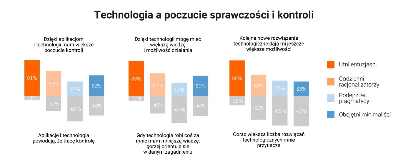 Bardzo duże różnice między grupami ujawniły się także, jeśli chodzi o poczucie kontroli i sprawczości. 71 proc. wszystkich badanych deklarowało, że technologia daje im większe poczucie kontroli, ale ten uśredniony wynik maskuje bardzo odmienne opinie w poszczególnych segmentach. Aż 91 proc. ufnych entuzjastów uważa, że dzięki aplikacjom i technologii mają większe poczucie kontroli, a 88 proc., że dzięki niej mogą mieć większą wiedzę i możliwość działania. W pozostałych grupach takiego samego zdania jest tylko od 1/3 do 2/3 badanych. I o ile tylko co piąty ufny entuzjasta uważa, że „coraz większa liczba rozwiązań mnie przytłacza”, to w pozostałych grupach uważa tak znacznie ponad połowa badanych Polaków.
