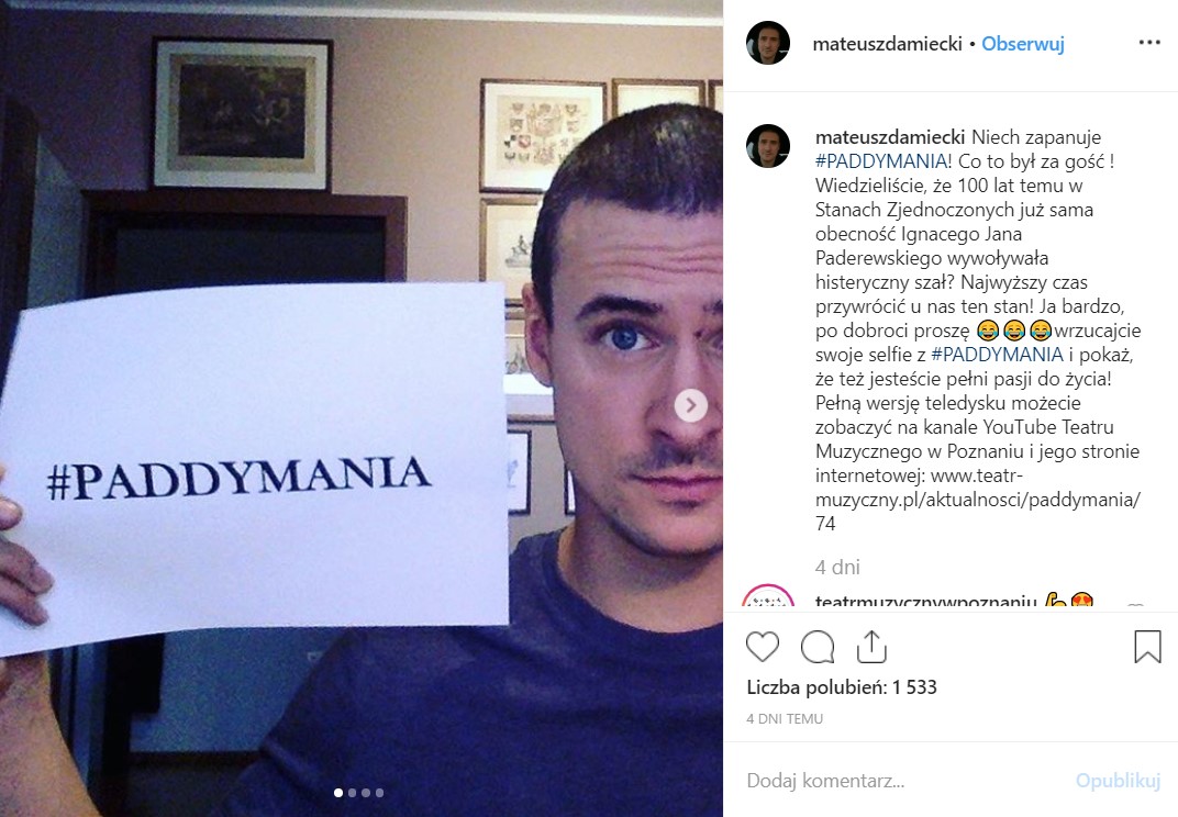 Ponadto, zaplanowana wokół teledysku akcja ma na celu wzbudzenie zainteresowania nowoczesnym patriotyzmem w atrakcyjny sposób, budowanie pozytywnego wizerunku Polski na świecie oraz świętowanie obchodów 100-lecia odzyskania niepodległości. Teatr Muzyczny w Poznaniu przywraca #Paddymanię poprzez publikowanie w social mediach minutowej wersji teledysku (stworzonej specjalnie z myślą o tych kanałach komunikacyjnych) wraz ze zdjęciem z maską z wizerunkiem Paderewskiego lub z hasztagiem #paddymania.