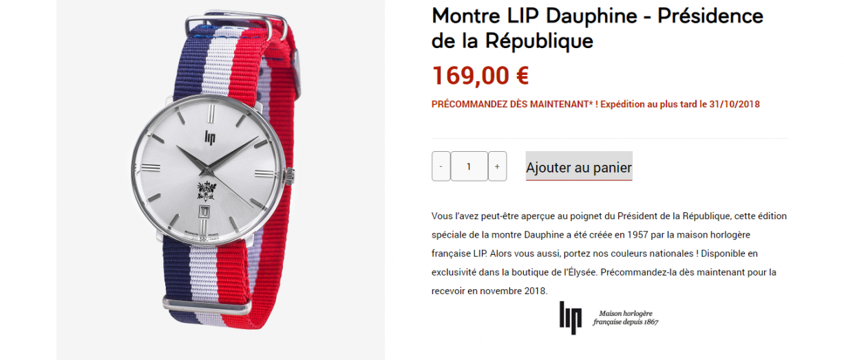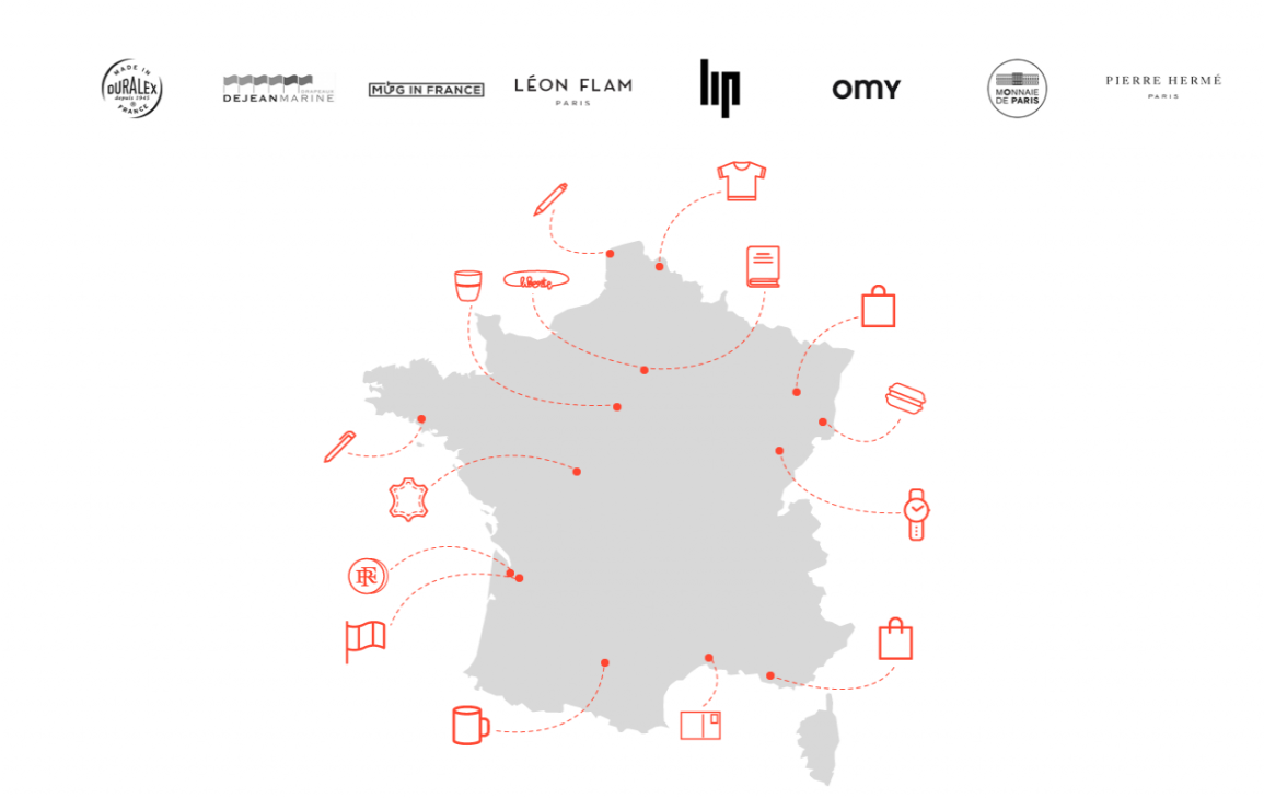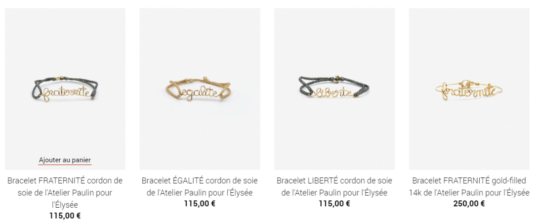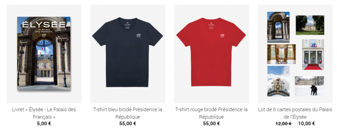 Trójkolorowe długopisy, torby na zakupy z napisem „Première Dame” i „Président”, monety i szklanki – oficjalna oferta Pałacu Elizejskiego została stworzona we współpracy z francuskimi firmami. Wszystkie produkty powstały we Francji, co zostało wyraźnie zaznaczone w ich opisach. W sklepie można kupić m.in. zaprojektowane przez Atelier Paulin złote bransoletki ze słowami „wolność”, „równość” i „braterstwo” oraz wyprodukowany przez markę Lip zegarek z trójkolorową bransoletą, który – jak podkreśla Le Figaro – prezydent Emmanuel Macron z dumą pokazywał przez 2 tygodnie przed uruchomieniem sklepu internetowego.