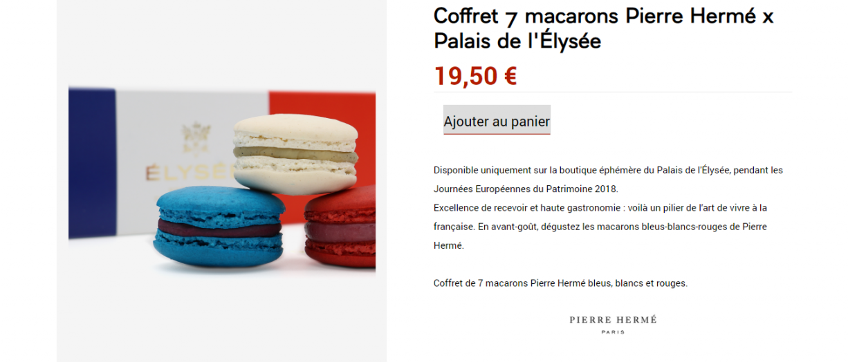 Z okazji Europejskich Dni Dziedzictwa i uruchomienia e-sklepu specjalne niebieskie, białe i czerwone makaroniki przygotował słynny cukiernik, Pierre Hermé. Dostępne są one w ofercie tymczasowo. Według Le Figaro organizacja Élysée planuje nawiązywanie podobnych partnerstw i tworzenie limitowanych kolekcji przy okazji najważniejszych wydarzeń krajowych i świąt, takich jak Boże Narodzenie.