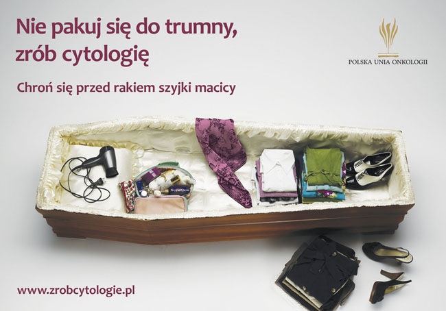 Niczym przed przeprowadzką albo daleką podróżą kobieta pakuje swoje rzeczy, tyle że nie wkłada ich do walizki, ale do trumny. Kampania „Nie pakuj się do trumny, zrób cytologię”