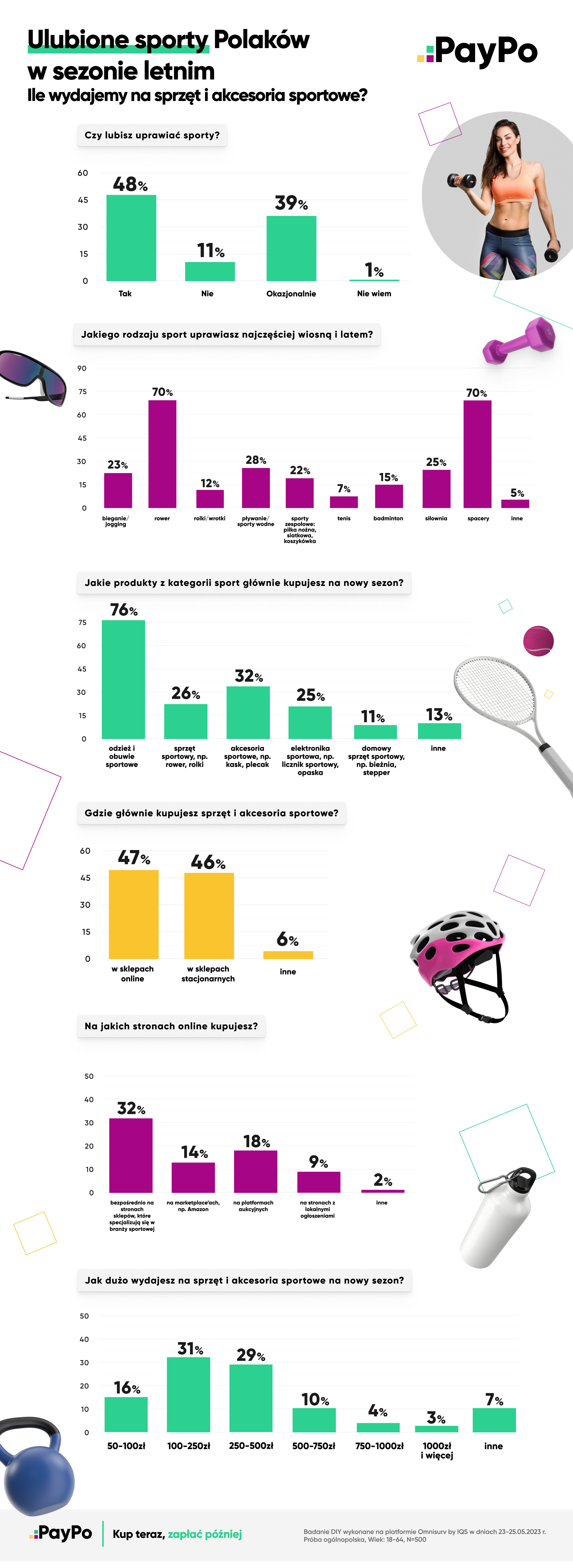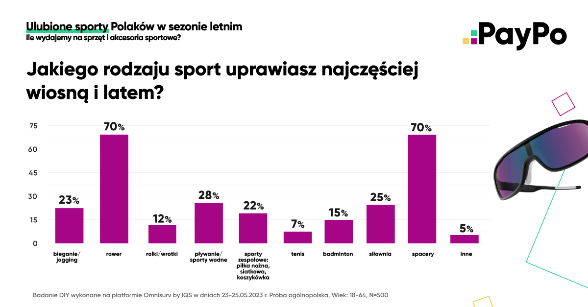 Z badania przeprowadzonego przez PayPo wynika, że niespełna połowa Polaków lubi uprawiać sport. Jeśli już decydują się na taką formę spędzania czasu, wiosną i latem najchętniej wybierają rower lub spacery. Przygotowując się do nowego sezonu, zdecydowana większość Polaków kupuje odzież i obuwie sportowe, a także sprzęt i akcesoria, których cena mieści się zazwyczaj w przedziale od 100 do 500 zł. Jaką formę zakupów preferują i gdzie najczęściej nabywają nowe produkty?