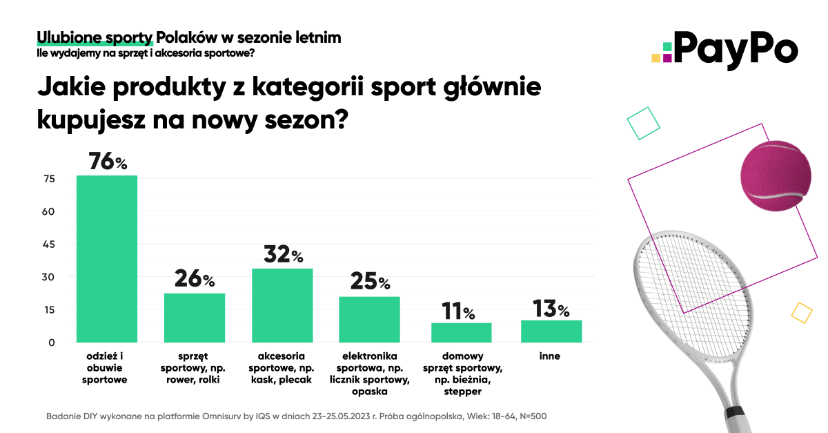 Jak wynika z badania PayPo, aż 76 proc. Polaków, przygotowując się na letni sezon sportowy, kupuje nową odzież i obuwie sportowe. Mniejszą popularnością cieszą się natomiast akcesoria sportowe jak kask czy plecak (32 proc.), sprzęt sportowy, np. rower i rolki (26 proc.) oraz elektronika sportowa, którą wybiera ¼ badanych. Polacy zdecydowanie najrzadziej kupują domowy sprzęt jak stepper czy bieżnia, co potwierdziło zaledwie 11 proc. ankietowanych. Pozostałe 13 proc. kupuje produkty innego rodzaju.