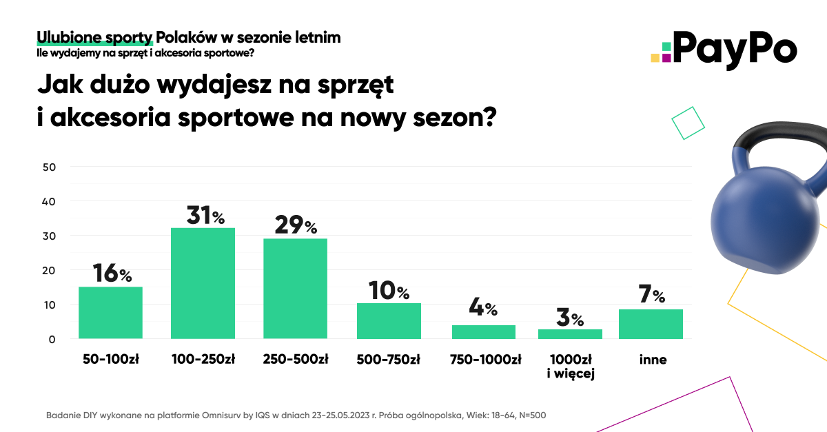 PayPo postanowiło sprawdzić również, ile pieniędzy Polacy wydają na sprzęt i akcesoria sportowe. Ankietowani wskazali, że najczęściej przeznaczają na ten cel kwotę od 100 do 250 zł (31 proc.) lub od 250 do 500 zł (29 proc.). 16 proc. Polaków wydaje na zakupy od 50 do 100 zł. Polacy są w stanie jednak inwestować wyższe kwoty w sprzęt i akcesoria – 10 proc. zadeklarowało wydatki na poziomie 500-750 zł, 4 proc. – 750-100 zł, a 3 proc. jest w gotowe wydać nawet powyżej 1000 zł. 7 proc. deklaruje, że na zakupy związane z nowym sezonem sportowym przeznacza jeszcze inną kwotę.