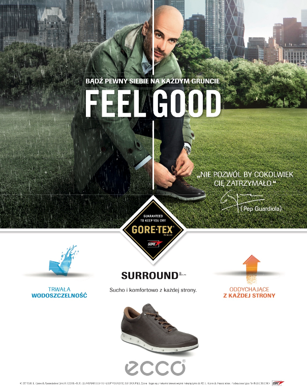 Pep Guardiola w butach ECCO COOL z technologią GORE-TEX® SURROUND™ to efekt globalnego kontraktu z koncernem W. L. Gore & Associates (Gore), w ramach którego jeden z najbardziej rozpoznawalnych na świecie futbolowych szkoleniowców będzie przez cztery lata reprezentował markę GORE-TEX® oraz ubrania i obuwie Gore. Gore jest licencjonowanym partnerem wielu marek odzieżowych i obuwniczych i to dlatego Guardiola tej wiosny nie tylko w reklamach, ale także na co dzień pojawia się w butach marki ECCO COOL z technologią GORE-TEX® SURROUND™. Także dlatego, że jest pod wrażeniem perfekcjonizmu wkładanego w rozwój marki GORE i w podnoszenie jakości produktów z technologią GORE-TEX® SURROUND™ .