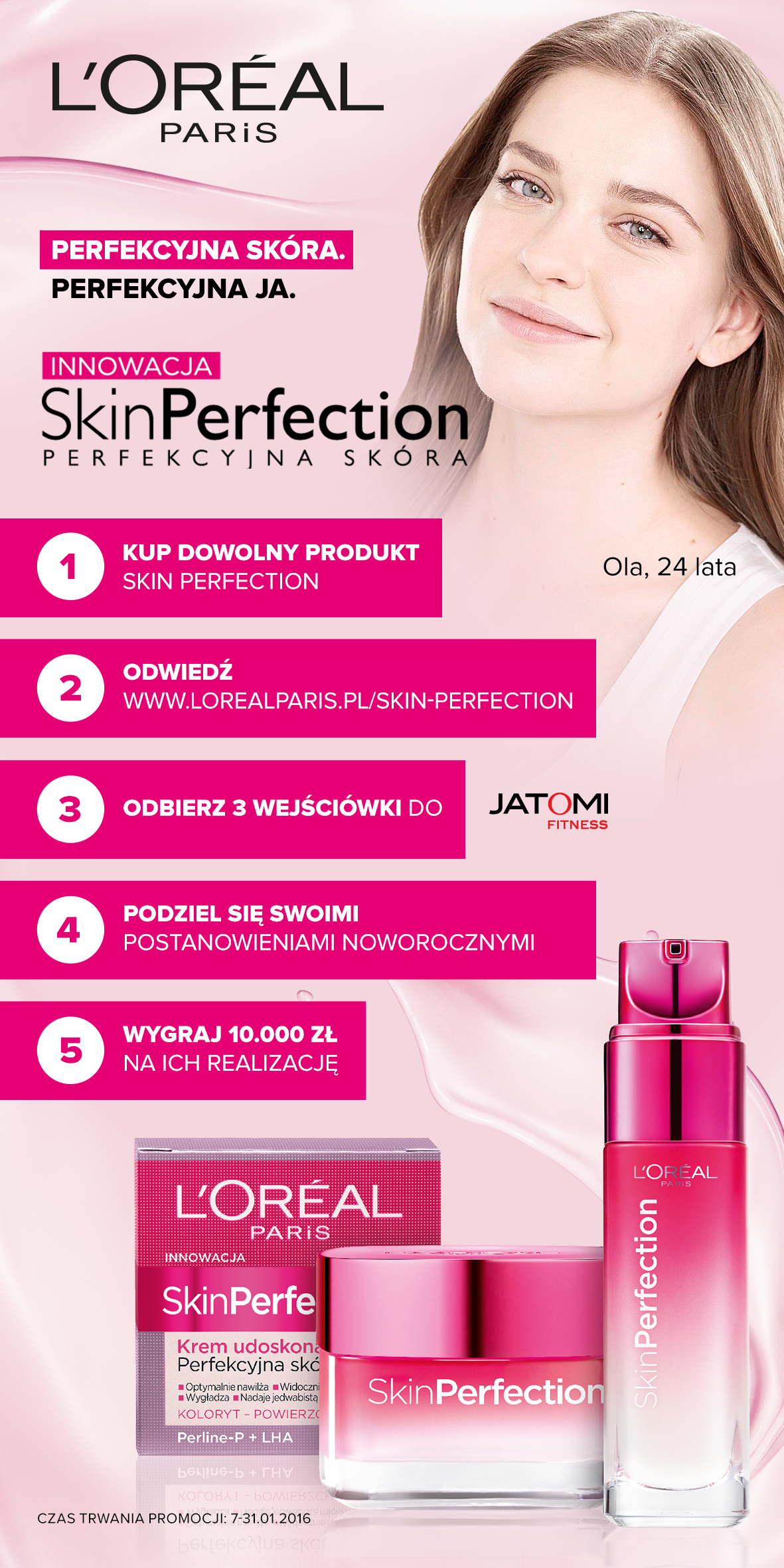 Akcja promocyjna w klubach Jatomi Fitness jest częścią styczniowej kampanii L’Oréal Skin Perfection opartej na komunikacji realizacji postanowień noworocznych pod hasłem „Perfekcyjna skóra. Perfekcyjna ja.”. Konsumentki mogą stworzyć własną listę celów do wykonania i podzielić się nią z innymi użytkowniczkami na dedykowanej stronie www.lorealparis.pl/skin-perfection. Aktywacją wspierającą jest konkurs na Instagramie, na którym przy pomocy hashtagów #skinperfectionkonkurs #jestemtegowarta zbudowana została społeczność dziewczyn pokazujących realizację postanowień noworocznych.