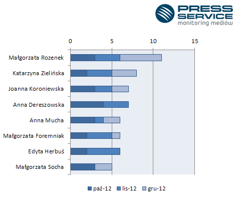 Małgorzata Rozenek była najbardziej atrakcyjną celebrytką z punktu widzenia redakcji pism kobiecych w czwartym kwartale 2012 roku. Na okładkach pojawiła się aż 11 razy – wynika z raportu przygotowanego przez „PRESS-SERVICE Monitoring Mediów”, w którym przeanalizowano 50 tytułów z prasy dla pań.