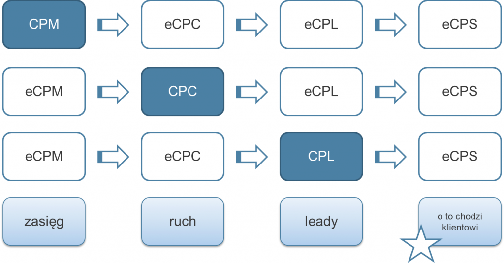 Każdy model rozliczeniowy kampanii performance (w tym przypadku wybraliśmy trzy najbardziej popularne – CPM, CPC, CPL) można więc, dysponując odpowiednio pełnymi i wiarygodnymi danymi, przeliczyć na pozostałe modele: CPM na eCPC, eCPL i eCPS; CPC na eCPM, eCPL i eCPS etc. Można w związku z tym pokusić się o wskazanie „wspólnego mianownika” w obliczaniu wydatków na kampanię (reklamodawca) i przychodu z niej (wydawca): eCPM.