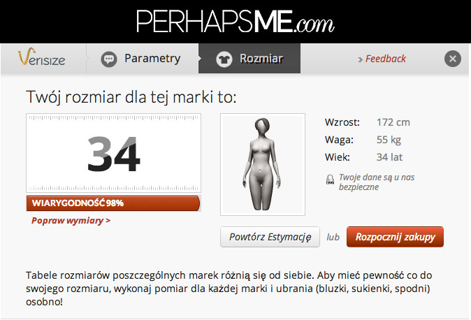 Dzięki nowoczesnej technologii, klientki PERHAPSME.com nie będą już musiały mierzyć się krawieckim centymetrem i studiować tabel rozmiarów różnych marek. Wystarczy, że do kalkulatora rozmiarów, anonimowo i bez rejestracji, wpiszą swój wzrost, wagę, wiek oraz wybiorą typ budowy ciała. W ciągu kliku sekund uzyskają informację, jaki numer ubrania danej marki będzie dla nich najlepszy.