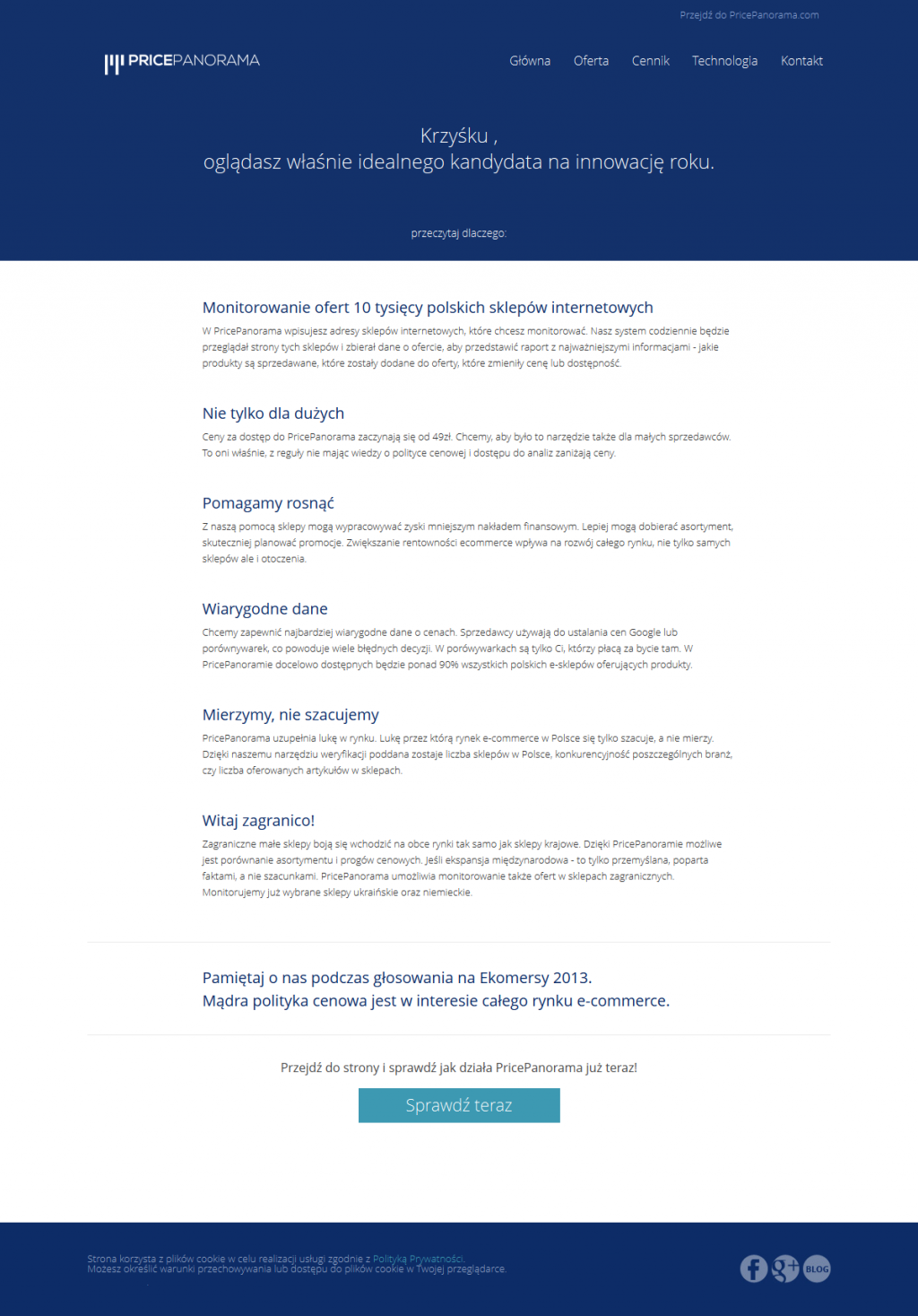 Stworzyliśmy stronę, na której opisaliśmy dlaczego to właśnie PricePanorama jest innowacją roku w dziedzinie e-commerce. Strona miała dedykowany nagłówek, skierowany dla każdego z członków jury.