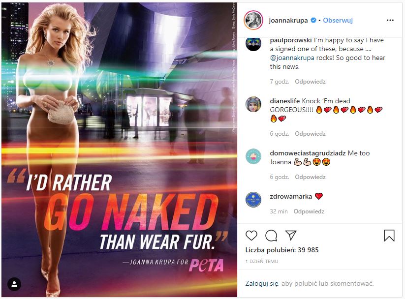 PETA rozpoczęła kampanię „I’d Rather Go Naked Than Wear Fur” w 1990 roku. Miała ona na celu przekonanie branży modowej do tego, aby wycofała się ona z wykorzystywania zwierząt w celu pozyskania ich futer na odzież. Na przestrzeni lat w kampanii wzięło udział wiele gwiazd ze świata mody, sportu, filmu czy muzyki, jak Pamela Anderson, Pink, Wendy Williams, Gillian Anderson, Eva Mendes, Sarah Jessica Parker czy Polka Joanna Krupa, która niedawno w poście dotyczącym zakończenia kampanii przypomniała swoje zdjęcia w niej wykorzystane kilka lat temu.