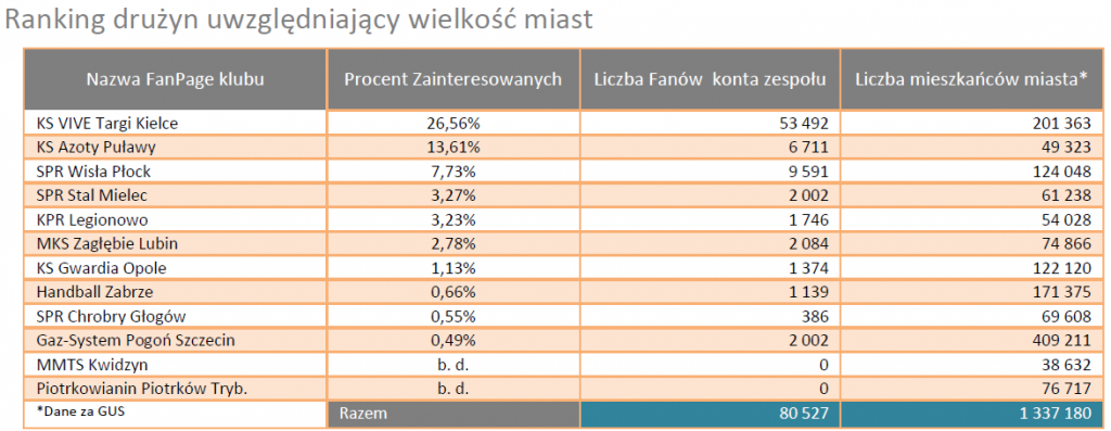 Procent zainteresowanych [PZ] – został obliczony na podstawie ilorazu liczby fanów konta zespołu przez liczbę mieszkańców miasta. Najwyższy [PZ] odnotowaliśmy podobnie jak w poprzednim rankingu dla konta zespołu Vive Targi Kielce. Co ciekawe, w odróżnieniu do np. żużlowej Enea Ekstraligi nie zanotowaliśmy stałej tendencji zajmowania czołowych lokat w rankingu przez zespoły z mniejszych miast. Na czele rankingu znajdują się Kielce posiadające 201 tys. mieszkańców, a także czterokrotnie mniejsze Puławy, odpowiednio 49 tysięcy.